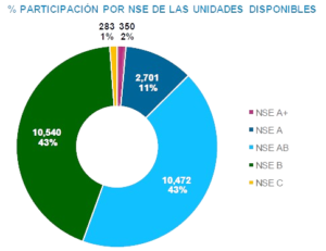 Tomando en cuenta las unidades disponibles al cierre del primer trimestre de 2024 (24,346 unidades) y las unidades vendidas durante el mismo periodo (3,264 unidades), se obtiene un total de 27,610 unidades, dirigidas principalmente al segmento socioeconómico AB.